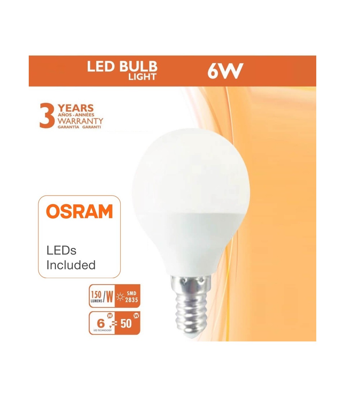 Illuminate your spaces with the 6W G45 LED bulb with OSRAM chip and E14 small screw base. This spherical bulb offers exceptional brightness with its 600 lumens of luminous flux, while saving energy thanks to its energy efficiency.