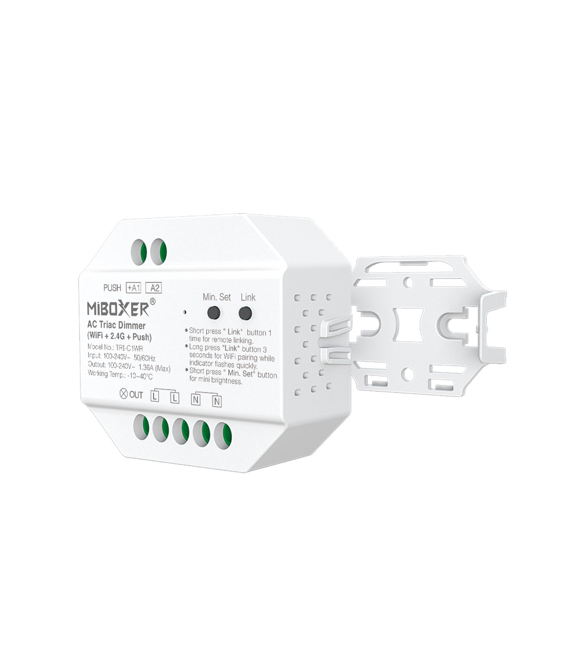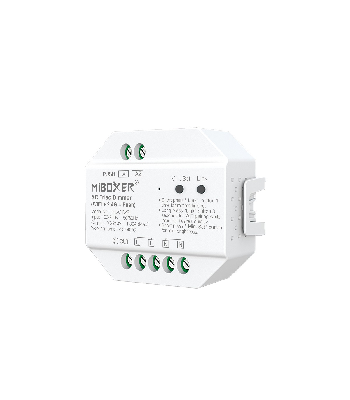 El atenuador MiBoxer TRI-C1WR es un atenuador inteligente de corriente alterna 230V (AC) que combina control por WiFi, radiofrecuencia 2.4G y pulsador físico (Push) en un solo dispositivo. Diseñado para ofrecer una regulación de luz suave y sin parpadeos, es compatible con una amplia gama de luminarias, incluyendo lámparas LED regulables, halógenas e incandescentes.