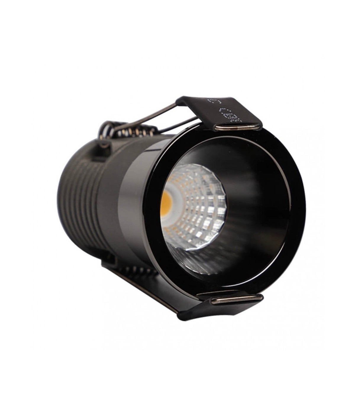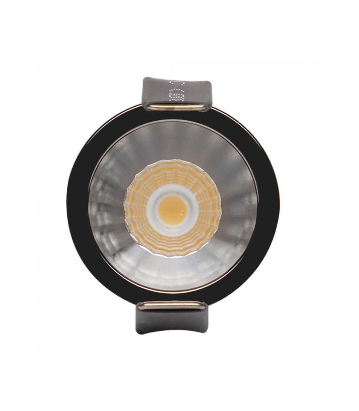 Foco LED empotrable mini de 5W con temperatura de color CCT seleccionable (3000K/4000K/6000K), dimensiones Ø40x55mm, corte en techo Ø35mm. Ángulo luminoso de 24º, fabricado en aluminio, acabado en negro cromo brillante, chip LED BridgeLUX COB 2630 DS-C30, 580 lúmenes, driver LIFUD sin flicker, CRI>95, UGR<11.