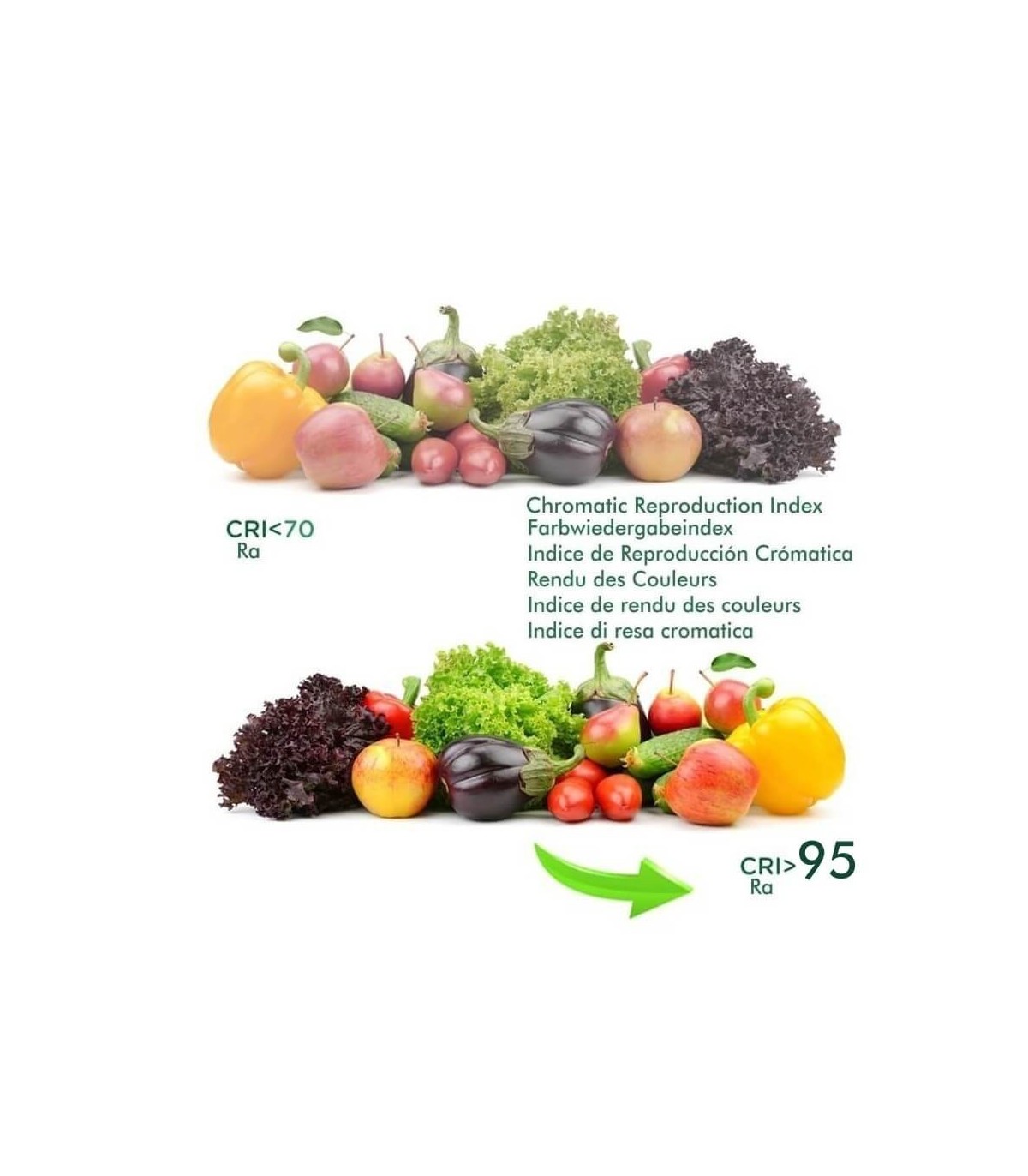 El índice de reproducción cromática (CRI) mide la capacidad de una fuente de luz para reproducir fielmente los colores en comparación con una fuente de luz natural. Un CRI superior a 95 significa que este foco LED puede mostrar colores de manera muy precisa y natural, ideal para entornos donde la precisión del color es crucial, como galerías de arte, estudios de fotografía y tiendas de ropa.