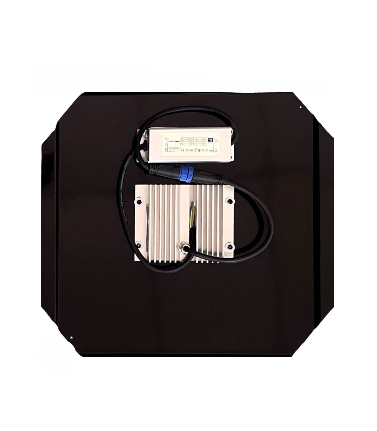 Incluye una placa de chapa de acero negro de alta resistencia, con dimensiones de 380×330 mm, diseñada para un montaje rápido y estable sobre farolas tipo Villa.