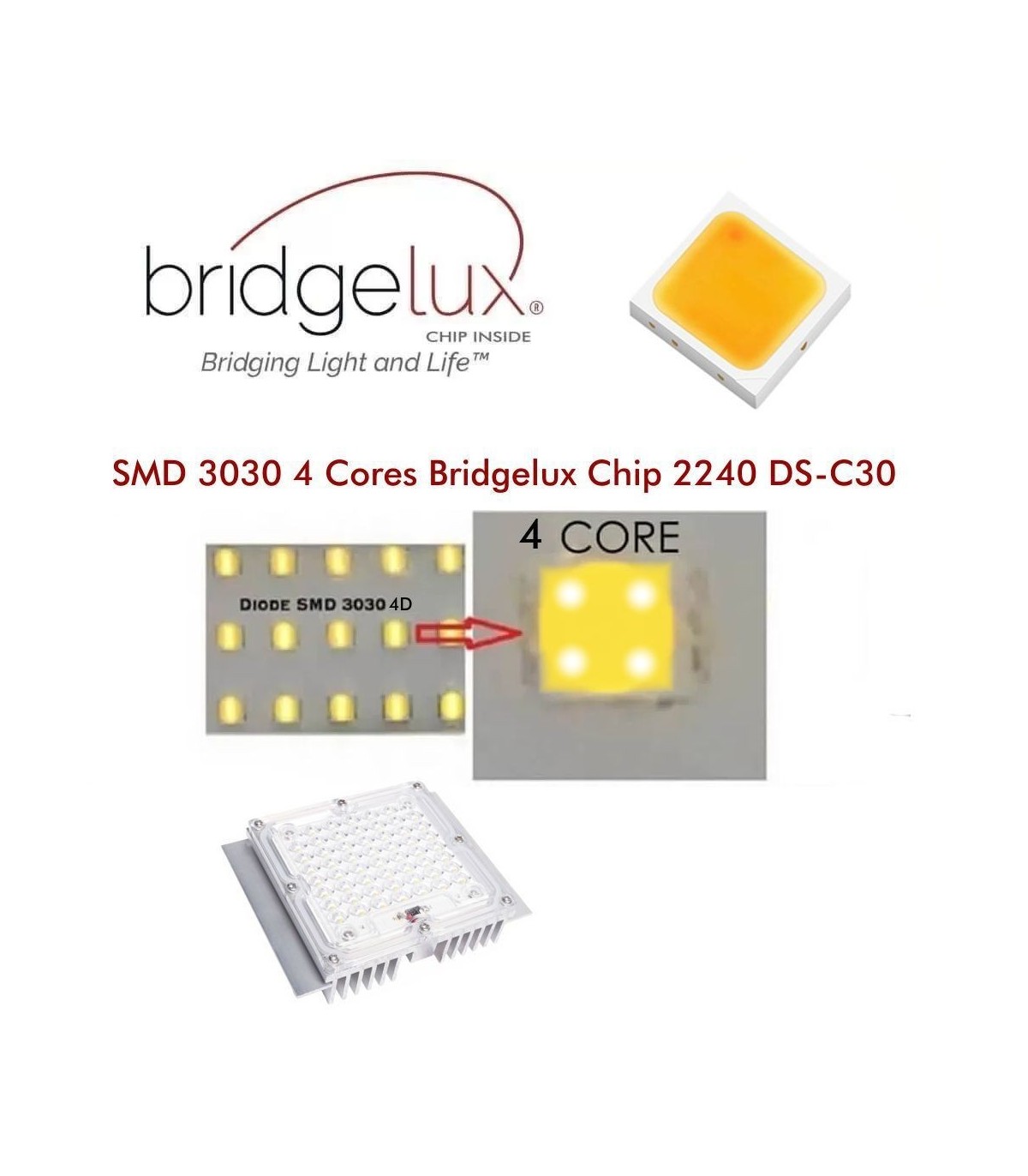 - Chip LED: BridgeLUX SMD3030 2D
