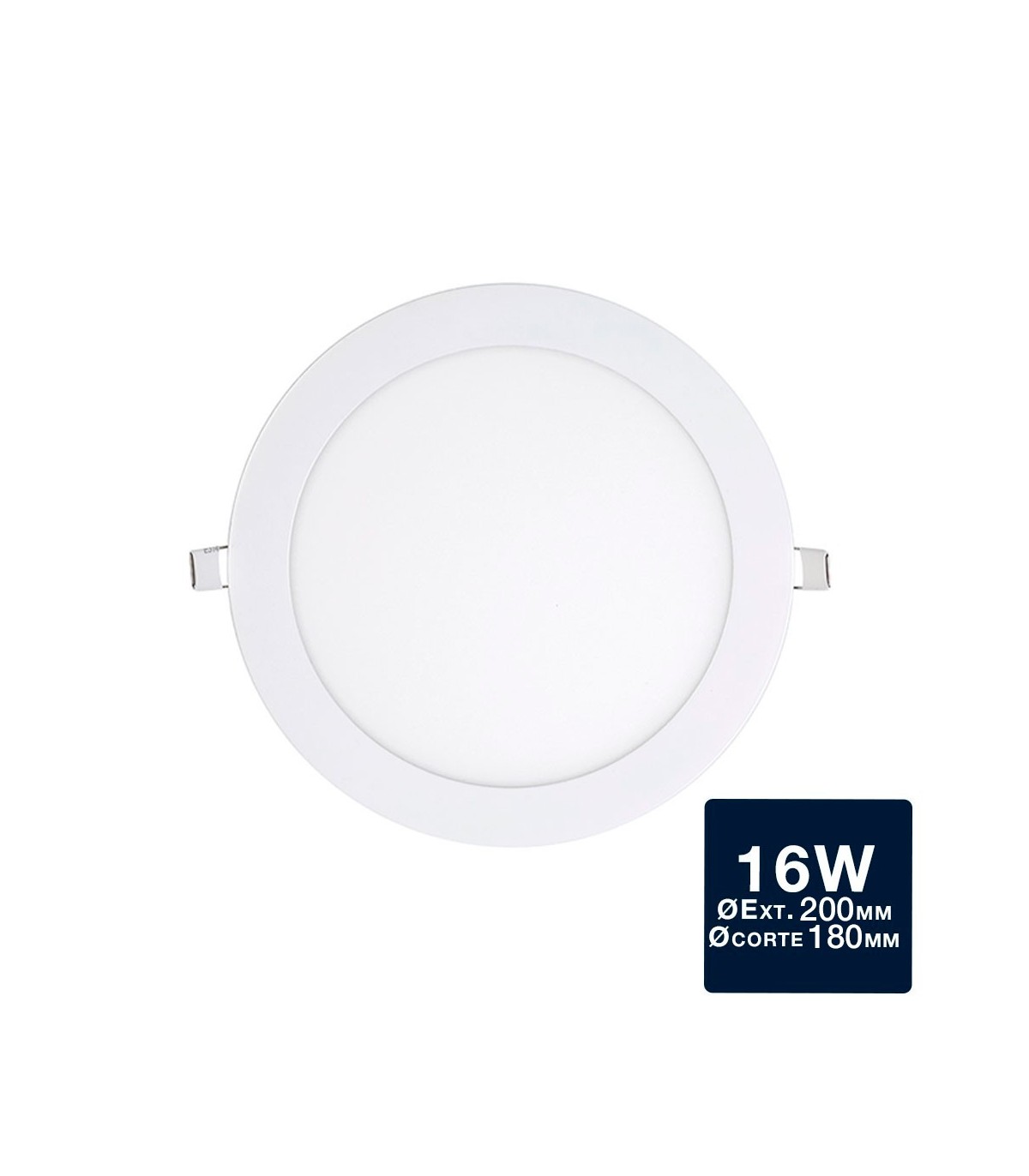 Placa downlight LED empotrable circular de 16W de potencia, con un flujo luminoso de 1280 lúmenes, y un diámetro exterior de 200mm. Fabricada en aluminio de alta calidad, lacado en color blanco de excelente acabado, y difusor de PC opal antideslumbrante.