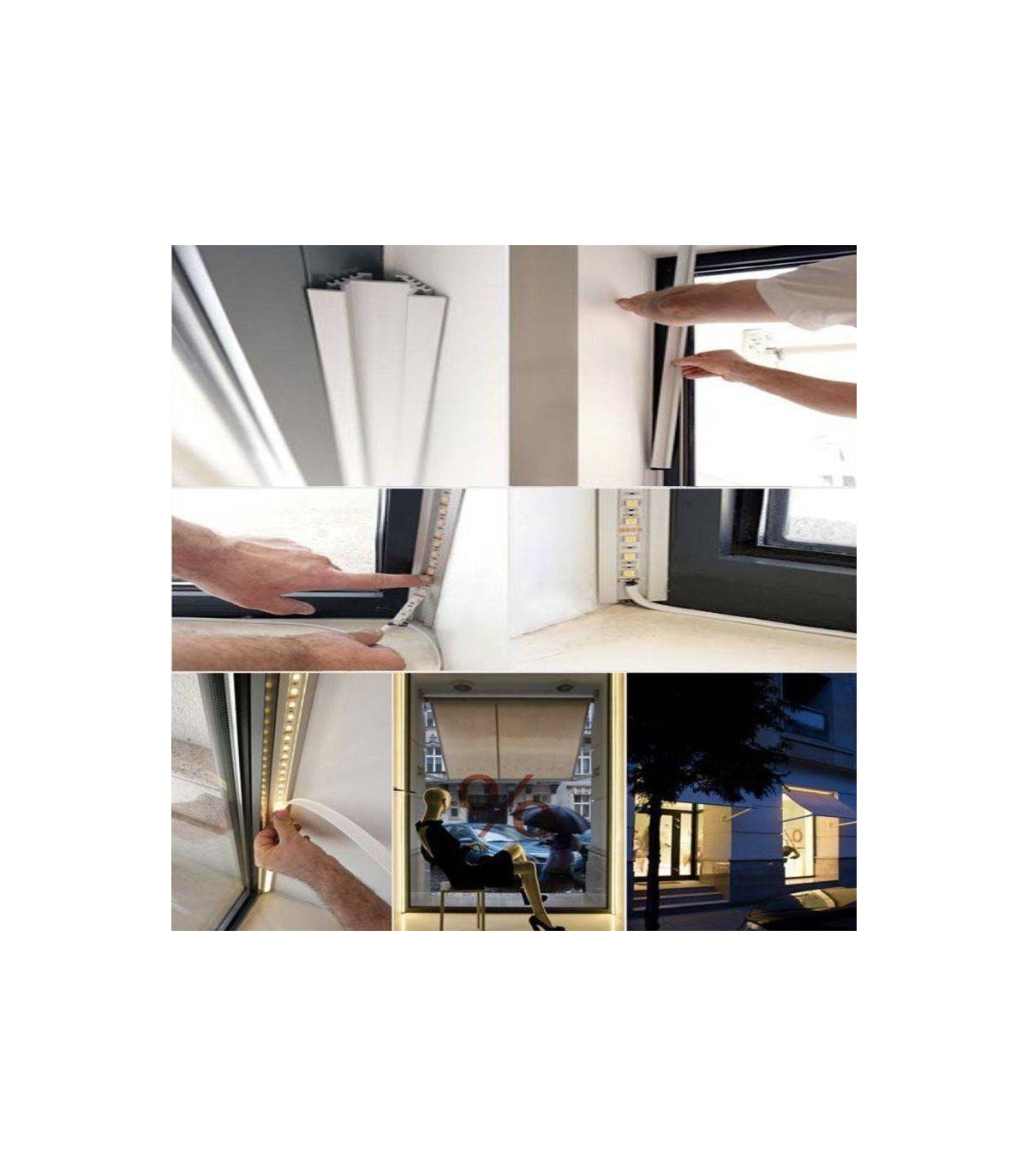 El kit completo incluye una barra de perfil de 2 metros, un difusor opal de 2 metros, 2 grapas metálicas para fijación y 2 tapas finales de plástico del color del perfil. El perfil puede albergar cualquier tira LED con un ancho máximo de 10mm y un grosor máximo de 4mm. Además, puede cortarse a medida con una sierra para metal para ajustarse a las necesidades específicas de tu proyecto.