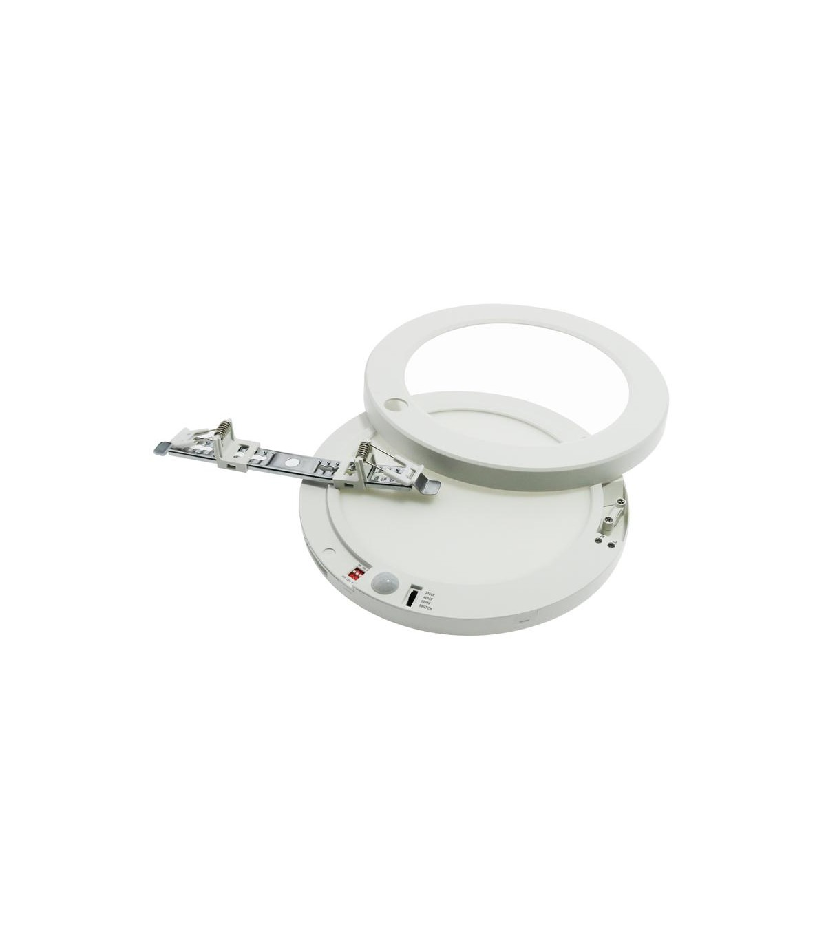 La configuración del plafón LED se realiza desde la parte frontal, desmontando el anillo embellecedor para un acceso rápido y sencillo a los controles.