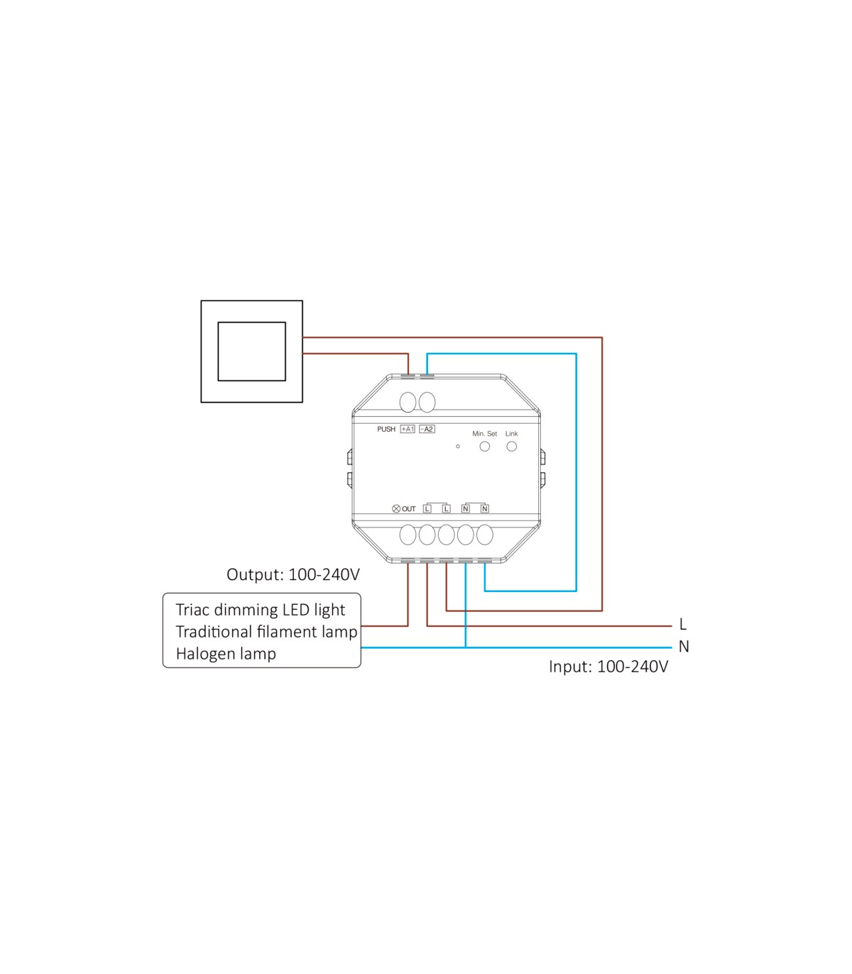 - Fonction Push : Allumage/extinction et réglage de la luminosité via un bouton poussoir mural. Le variateur s’installe derrière l’interrupteur.