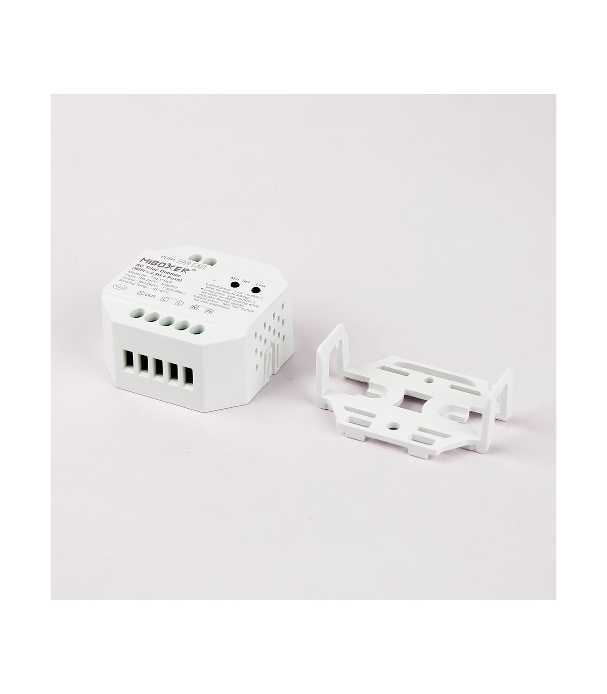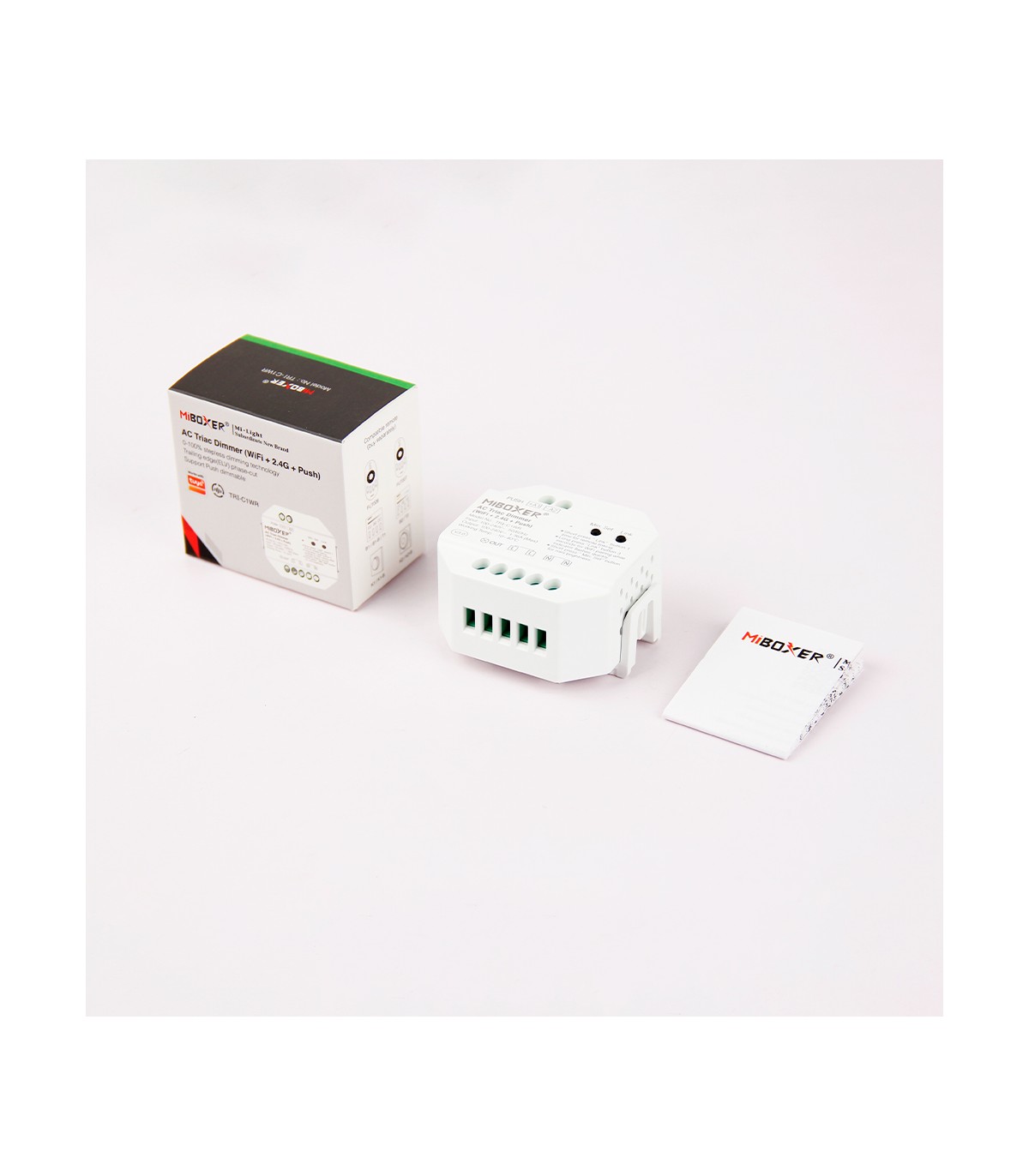Le variateur MiBoxer TRI-C1WR est un variateur intelligent pour courant alternatif 230V (AC) qui combine le contrôle via WiFi, RF 2.4G et bouton poussoir physique (Push) dans un seul appareil. Conçu pour offrir une régulation lumineuse fluide et sans scintillement, il est compatible avec un large éventail de luminaires, y compris les lampes LED dimmables, halogènes et incandescentes.