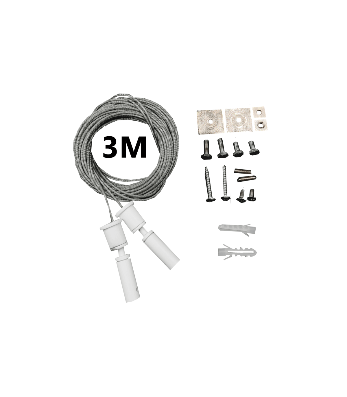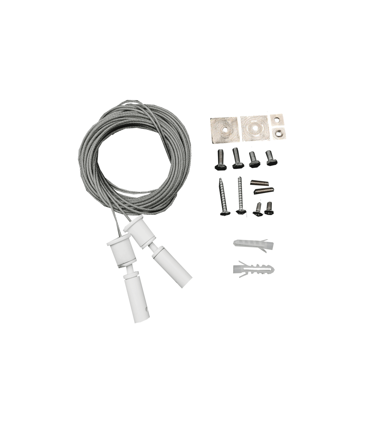 Kit di sospensione per binari, composto da 2 gruppi cavi in ​​acciaio e tutti gli accessori necessari per il montaggio.