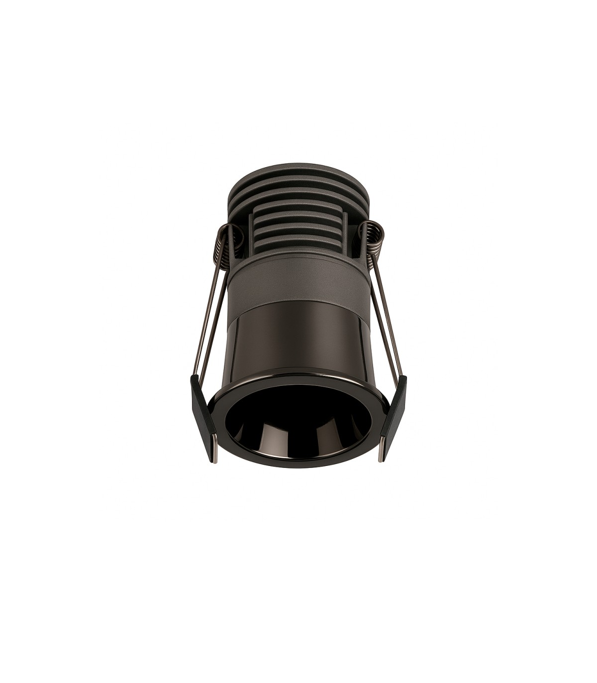 Faretto LED incassato mini da 5W con temperatura di colore CCT selezionabile (3000K/4000K/6000K), dimensioni Ø40x55mm, taglio nel soffitto Ø35mm. Angolo luminoso di 24º, realizzato in alluminio, finitura in cromo nero lucido, chip LED BridgeLUX COB 2630 DS-C30, 580 lumen, driver LIFUD senza sfarfallio, CRI>95, UGR<11.