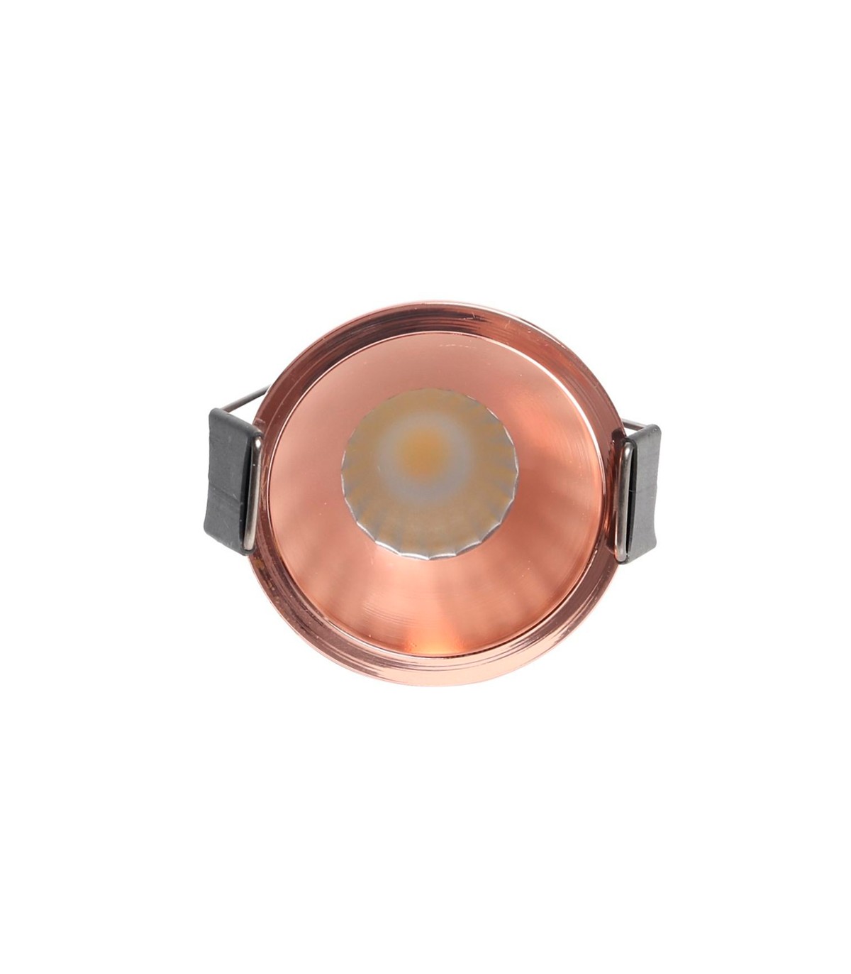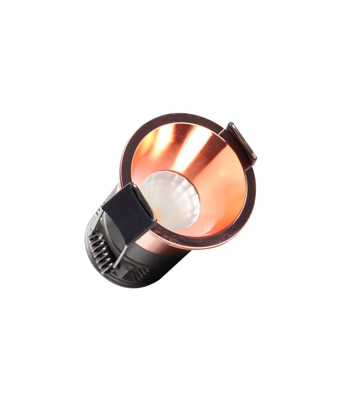 Faretto LED da incasso mini da 5W con temperatura di colore CCT selezionabile (3000K/4000K/6000K), dimensioni Ø40x55mm, foro nel soffitto Ø35mm. Angolo luminoso di 24º, realizzato in alluminio, finitura Gold Rose brillante, chip LED BridgeLUX COB 2630 DS-C30, 580 lumen, driver LIFUD senza sfarfallio, CRI>95, UGR<11.
