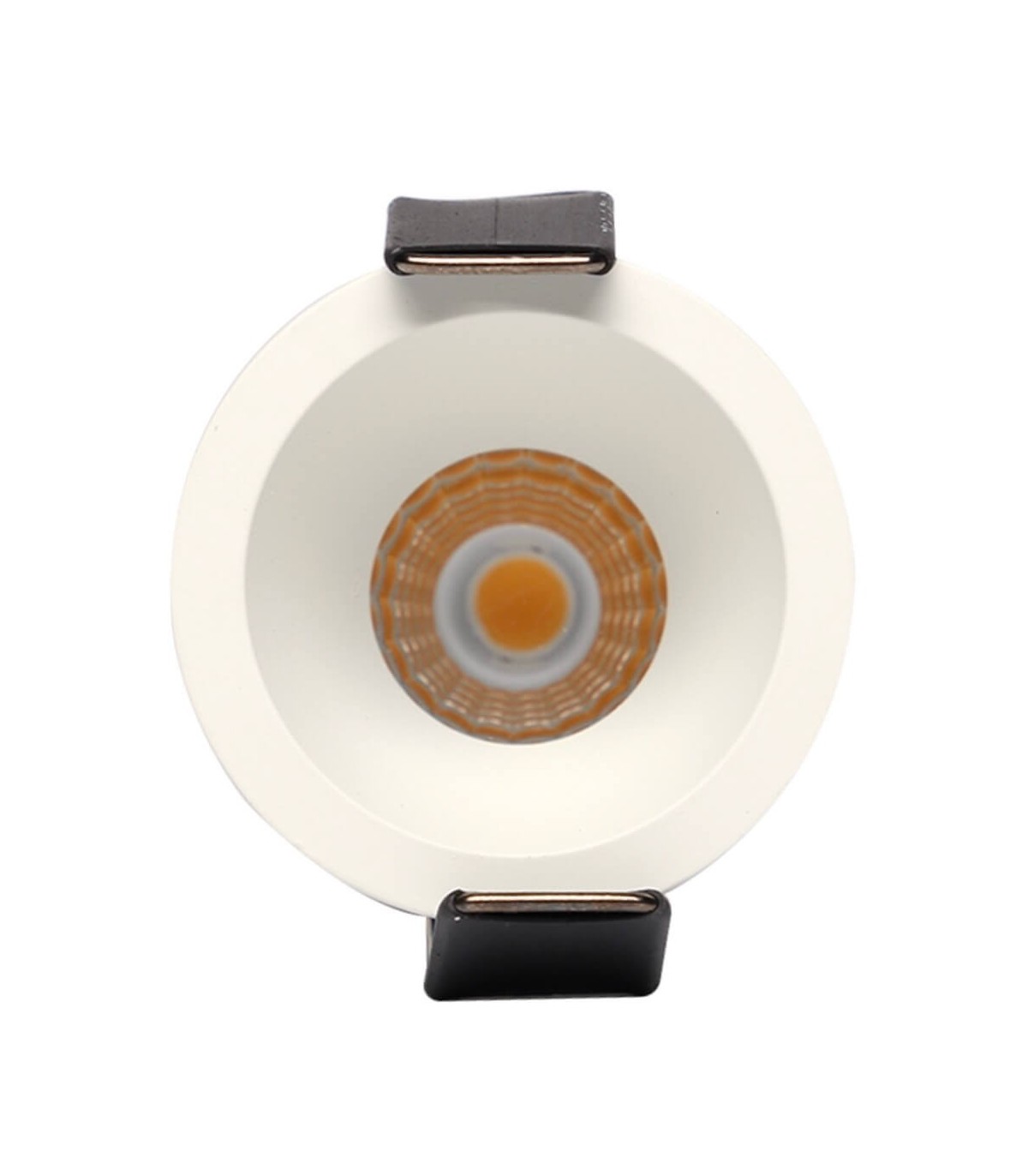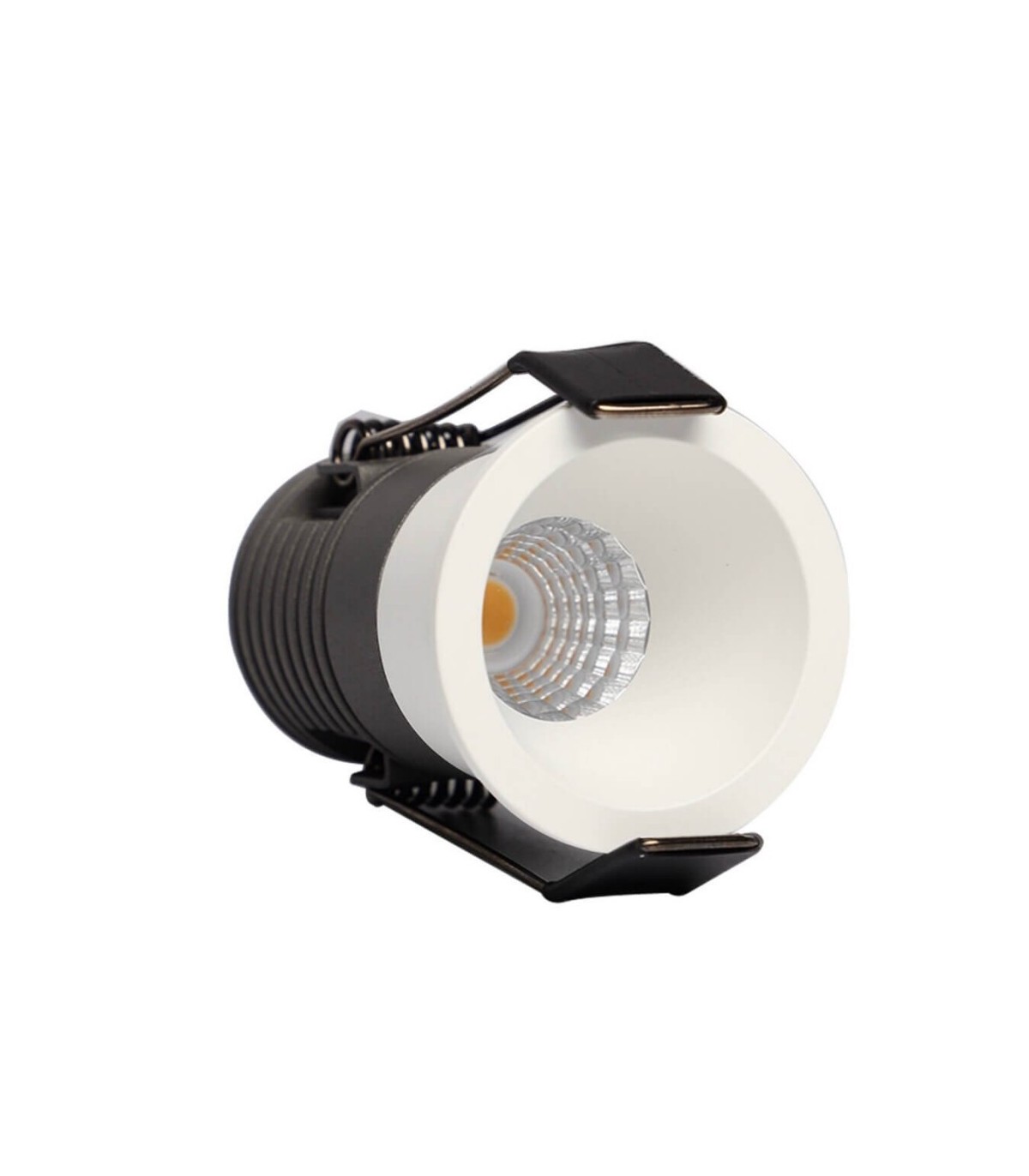 Faretto LED incassato mini da 5W con temperatura di colore CCT selezionabile (3000K/4000K/6000K), dimensioni Ø40x55mm, foro di taglio Ø35mm. Angolo luminoso di 24º, realizzato in alluminio, finitura bianco opaco, chip LED BridgeLUX COB 2630 DS-C30, 580 lumen, driver LIFUD senza sfarfallio, CRI>95, UGR<11.