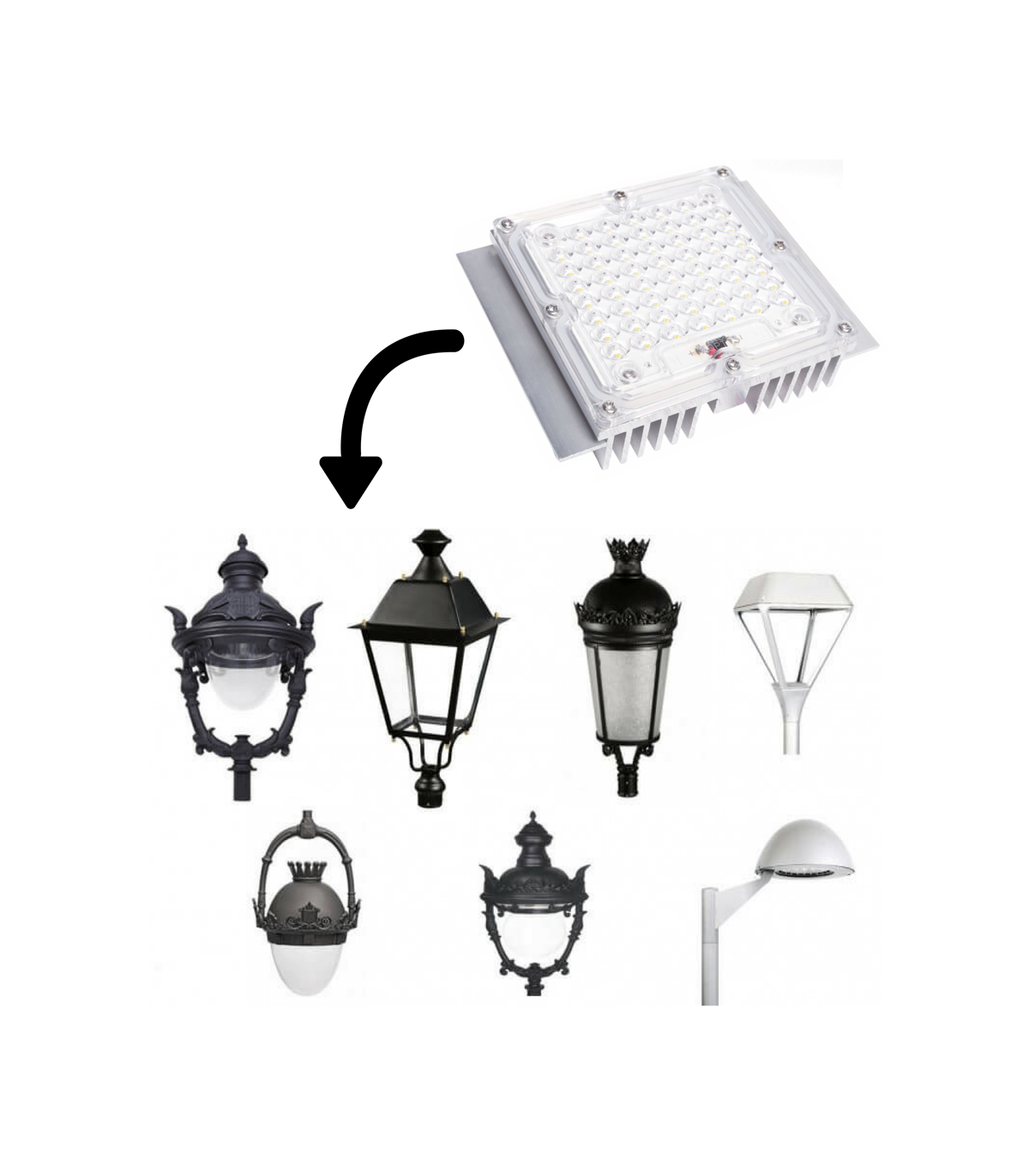 Blocco ottico LED da 40W con ottica efficiente e ottima dissipazione termica, progettato per l’installazione su lampioni tipo Villa. Offre un’illuminazione potente, uniforme e duratura, riducendo in modo significativo il consumo energetico.